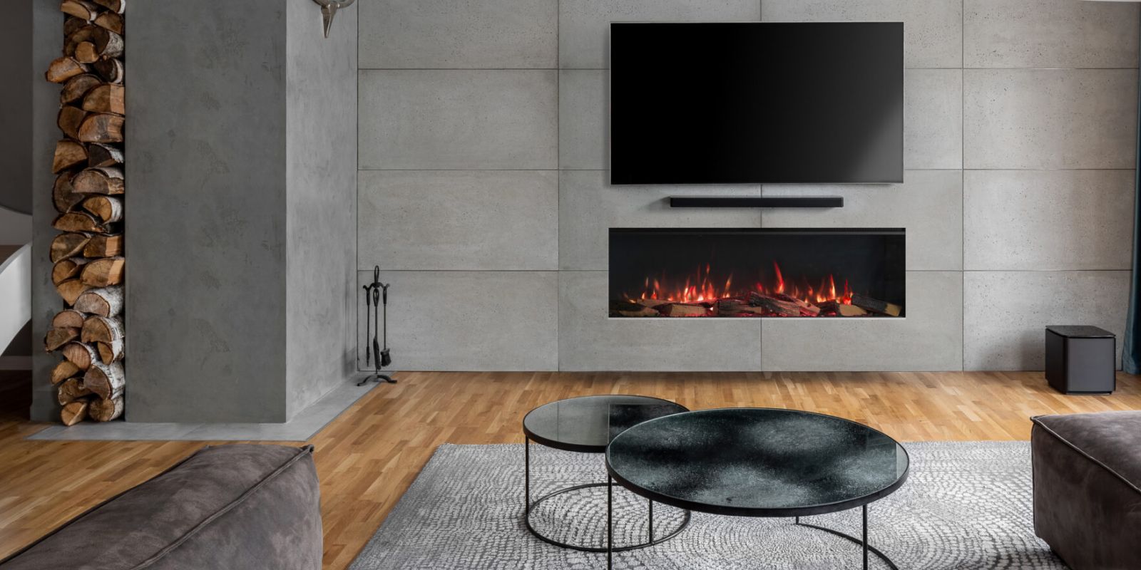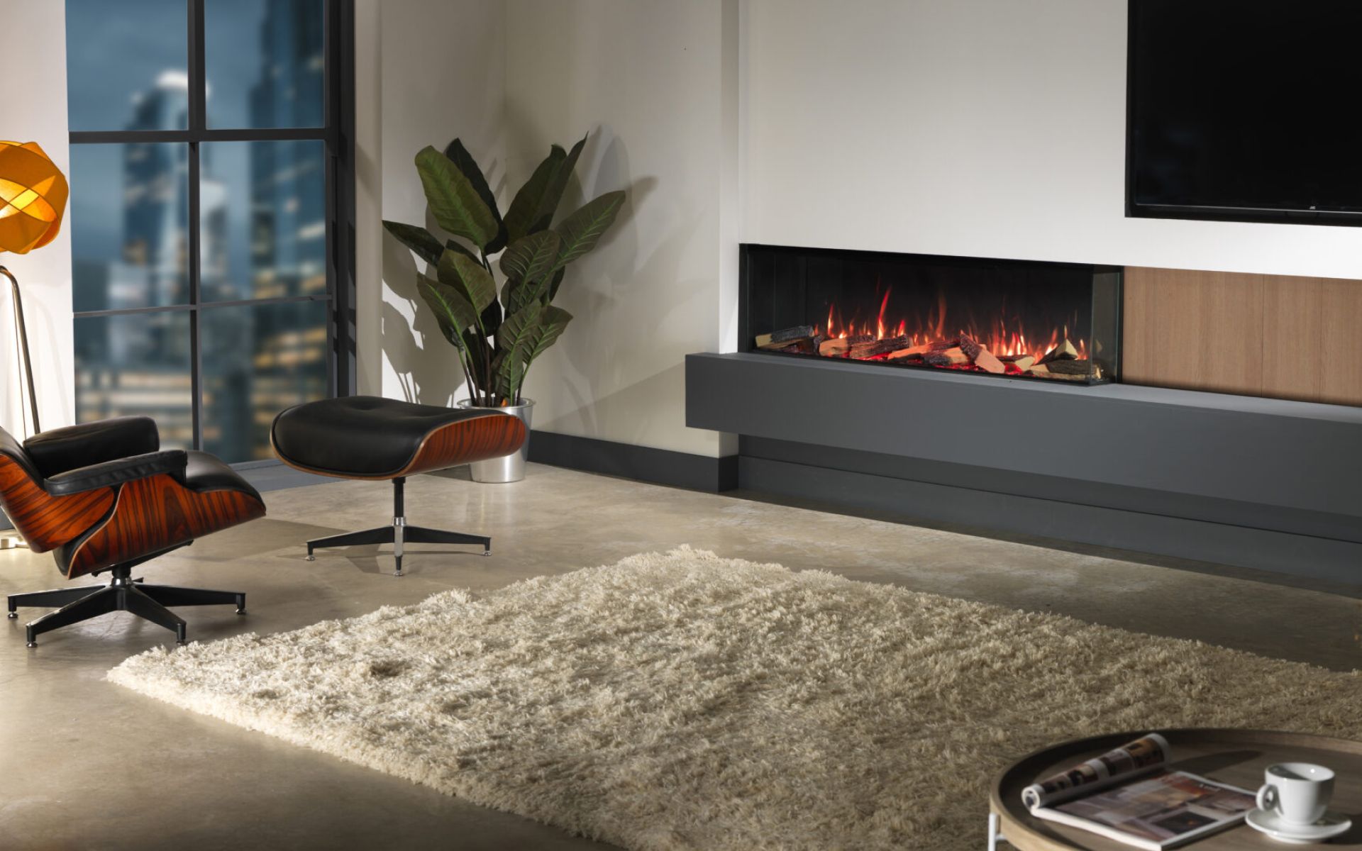 sfeerbeeld van woonkamer met elektrische inbouw haard onder de tv